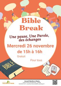 Bible Break, c’est un moment d’une heure pour se retrouver autour d’un texte de la Bible, dans un esprit d’écoute, de partage et de bienveillance.